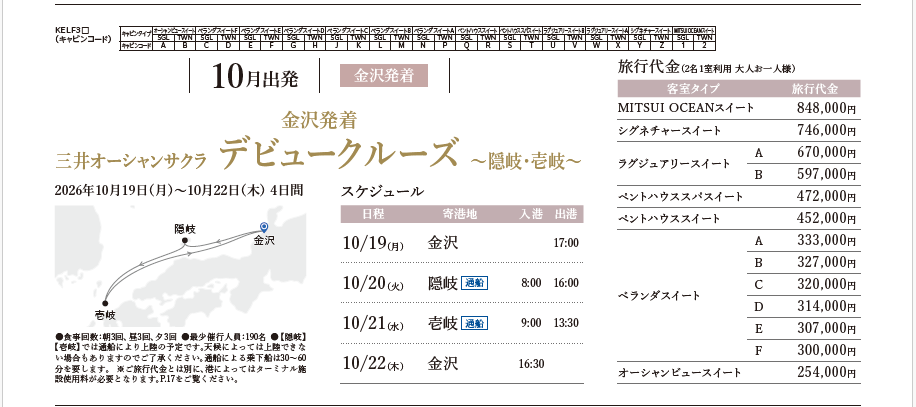 金沢発着!国内周遊だからパスポート不要。初めてのクルーズ旅にもおすすめ。三井オーシャンサクラで、隠岐・壱岐へゆったりとした船旅を楽しみませんか。 日時 2026年10月19日(月)〜2026年10月22日(木) 4日間 航路 金沢~隠岐~壱岐~金沢 乗船港 金沢 下船港 金沢 料金 254,000円〜848,000円 ●2名1室利用の大人お一人様料金です。 ●食事回数:朝3回、昼3回、夕3回 ●最少催行人員:190名 ●【隠岐】【壱岐】では通船により上陸の予定です。天候によっては上陸できな い場合もありますのでご了承ください。通船による乗下船は30~60分を要します。 ※ご旅行代金とは別に、港によってはターミナル施設使用料が必要となります。詳しくはお問い合わせください。 ▼▽ パンフレット ▽▼ ご予約/ご相談 お電話またはメール等でご予約、ご相談を承っております。お気軽にご連絡ください。 株式売会社トラベル・アイ Tel: 076-259-5517 (受付:平日10~17時) E-mail: info@travel-ai.net